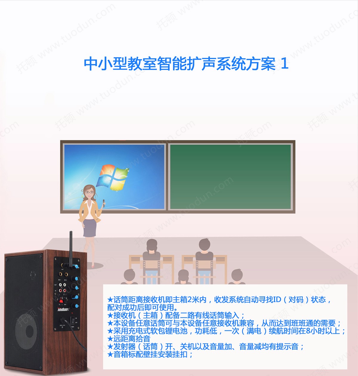 根据教学场景差异,提供不同的扩声音响设备;操作简单、架构简约,致力于为广大师生提供绿色健康的教学扩声课堂。