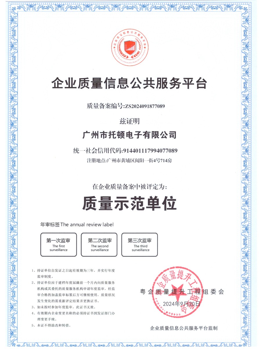 2024年9月19日,粤企质量提升工程组委会颁发托顿电子“质量示范单位”荣誉、 牌匾以及证书!