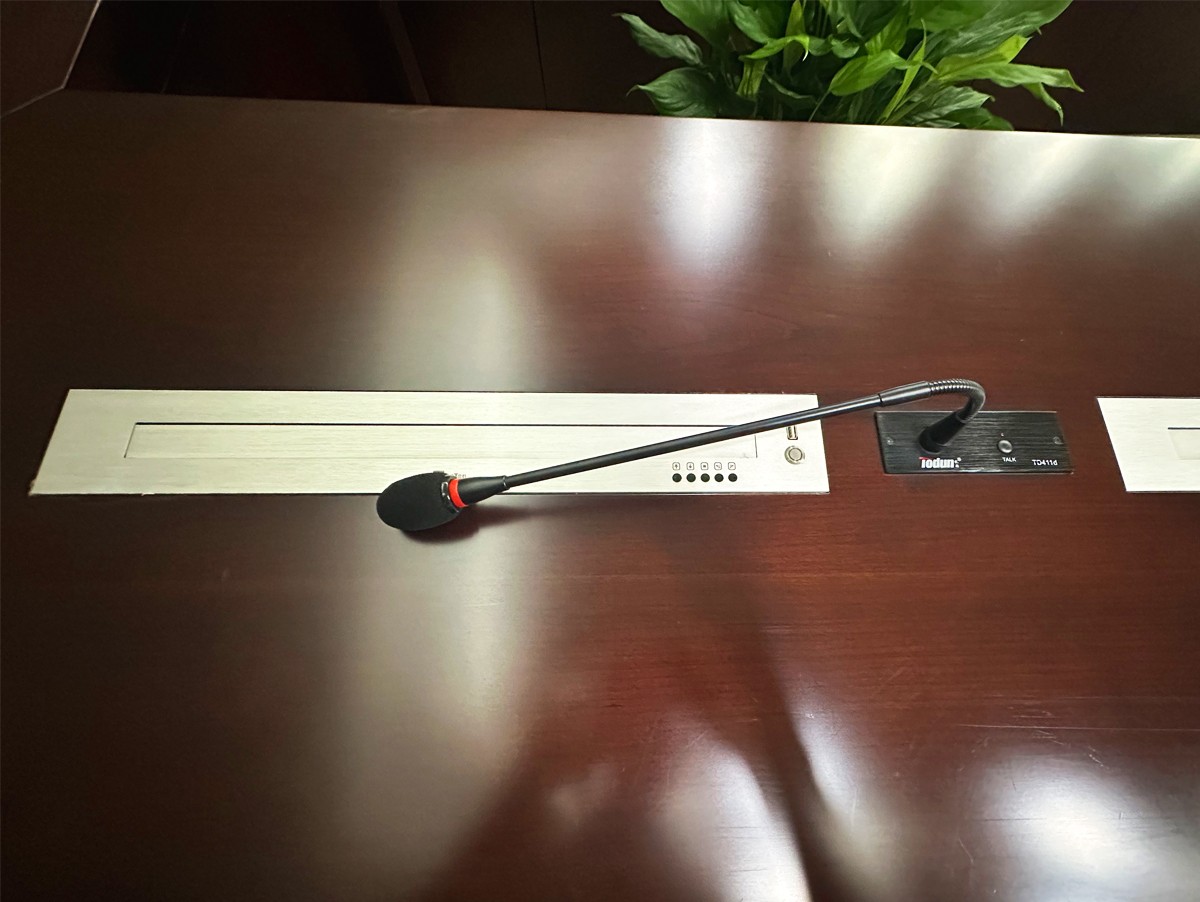 湖南省某事业单位选用托顿会议话筒,TD411采用嵌入式安装,便于日常使用与维护,解决传统会议话筒发言容易引起的啸叫、回声、拾音距离短等问题。TD411这款话筒以其精致的设计和卓越的性能,为会议提供了清晰的语音传达。TD411话筒的嵌入式设计不仅节省空间,而且与会议室的现代装饰风格相得益彰。其高灵敏度和定向拾音特性确保了声音的清晰度和准确性,即使在嘈杂的环境中也能保持良好的语音传达效果。此外,TD411话筒还具备抗干扰能力,能够有效屏蔽外界噪音,保证语音的纯净。这款话筒适用于政府机关、企业会议室、教育培训等多种场景,尤其适合需要高质量语音输出的正式场合。